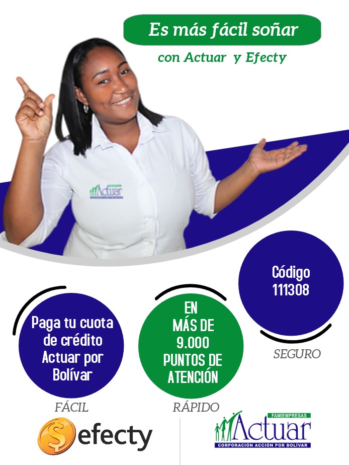 Querido microempresario, Actuar por Bolívar en alianza con Efecty, le ofrece la oportunidad de cancelar sus cuotas de manera más fácil, rápida y segura a través de la red de puntos de atención.